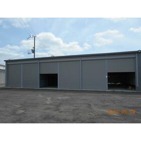 国道からの進入路となります!外観写真は同現場の同型写真です。約32坪はシャッター4枚分となります。(幅約12mとなります)