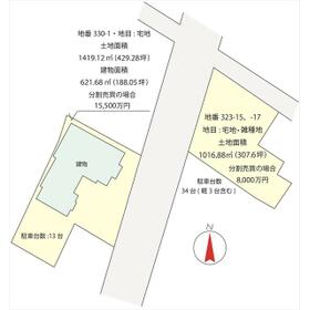 ・市街化調整区域(エリア指定)で建築要件は既存宅地で建設・既存用途は福利厚生施設(会館)となっているため事前に行政に事業内容等について確認が必要です  ・地番330-1:土地1419.12㎡(429.28坪)、建物621.68㎡(188.05坪) ・駐車場地番323-15、-17: 1016.88㎡(307.6坪) ・駐車場と分割での売買も可能