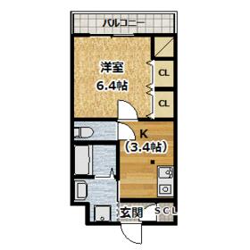 間取り 1K(洋 6.4 K 3.4) 専有面積 26.25m²