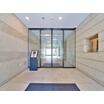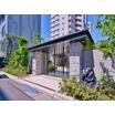 石貼りの柱に支えられた屋根、敷地の内と外を隔てるオートロック付自動ドア、