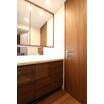 ・フィオレストーンのカウンタートップの洗面化粧台、木彫フレーム三面鏡収納