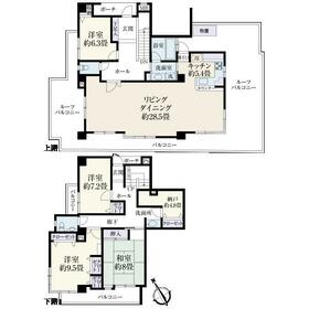 メゾネットタイプ(所在階4階・5階)/5階部分は最上階ルーフバルコニー面積45.23平米、2面の合計面積です、使用料:無償/バルコニー面積は3面の合計面積です/ポーチ面積5.18平米、使用料:無償/駐車場:敷地内