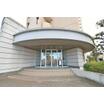 重厚感あるタイル貼りと、洗練された佇まいが目を引く大規模マンション。駅徒歩3分の利便性と、青空に映え