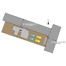 【区画図】現地区画図になります。角地にあります平家建のお家となります。お車並列・縦列で4台ほど駐車いただけそうです。お家裏側にはお庭スペースもございます。