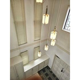 玄関が吹き抜けと出窓がとても素敵な洋館のような戸建住宅。ゆったり5LDKのこの字型の間取り。お庭がございます。学校にも近く子育て世代にもオススメ。
