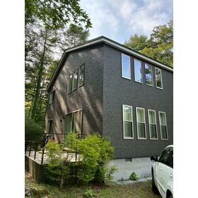 管理別荘地内の借地権です。築浅で綺麗に保たれた2階建てで、上部のFIX窓やリビングの吹き抜けが特徴的な明るく開放感のある別荘です。