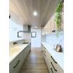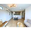 対面キッチンはリビング全体を見渡せる設計。ダイニングと横並びの配置で、配膳や片付けもスムーズです。ペンダントライトやデザイン照明が空間のアクセントとなり、シンプルながらも洗練された印象に仕上がっています。