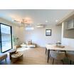 天井のアクセントクロスとフローリングの色味が美しく調和したLDKは、奥行きのあるゆとり空間。大きな窓から差し込む自然光が、時間とともに表情を変え、日々の暮らしに穏やかなリズムを生み出します。