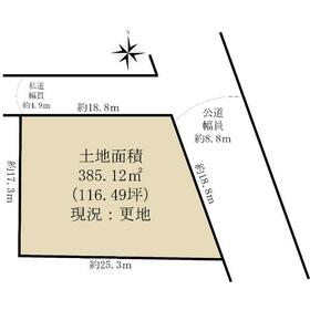 北側私道幅員約4.9mに約18.8m面する。