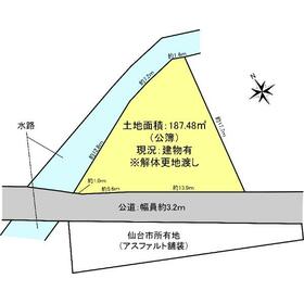 2024年12月に売主にて確定測量実施済み/敷地内に仙台市との間で締結された土地賃貸借契約対象部分が含まれます。(賃貸借契約・賃借料:月額619円。ただし2029年4月1日以降は再協議。期間:施設機能(下水道管)存続中。)/土地/187.48㎡(地形:三角形)。また敷地内に土地賃貸借契約対象部分(3.84㎡)有り/対象不動産北側高低差部分は、擁壁の代わりにブロック積で覆われた「がけ」が存します。