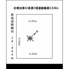 前面道路が公道の為建築基準法の接道条件は満たしますが、側面私道は二項道路の為