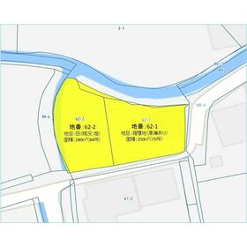 62番1敷地内に車庫(附合物)あり。 ・62番1(地目:雑種地)250㎡(75坪) ・62番2(地目:田・現況:畑)280㎡(84坪) ・上水道私設管引込の際は、本管の口径変更が必要です。